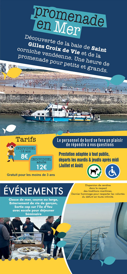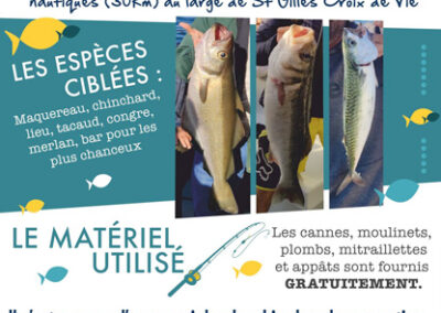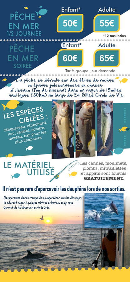 Pour les mordus de pêche, tenter l’expérience de la pêche en mer au côté de marins pêcheurs expérimentés et à votre service. Matériels et appâts fournis. Tous les poissons pêchés sont vidés et lavés à bord par nos soins, vous n’aurez qu’à les emporter et les déguster. Pour la promenade en mer, découverte de la baie de St Gilles Croix de Vie et de la corniche vendéenne, une heure de promenade pour petits et grands.