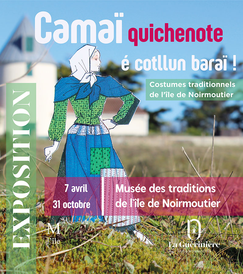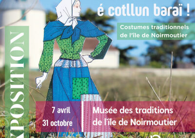 Le musée accueille chaque année une nouvelle exposition temporaire qui s’intègre à ce parcours. Vous êtes cette année conviés à un voyage haut en couleurs au cœur des traditions noirmoutrines. Présente dans toutes les salles du musée, l’exposition « Camaï, quichenote é cotllun baraï ! Costumes traditionnels de l’île de Noirmoutier » met à l’honneur les costumes traditionnels de l’île et vous invite à découvrir des tenues emblématiques, riches en détails et en histoires. Une immersion vivante et vibrante dans l’histoire vestimentaire de Noirmoutier !