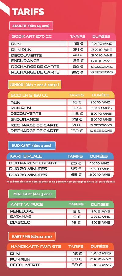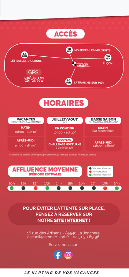 Le karting de vos vacances ! À seulement 10 minutes de La Tranche-sur-Mer, le Vendée Kart vous accueille dans une ambiance sportive et conviviale. Petits et grands peuvent découvrir le plaisir du pilotage en toute sécurité. Mini-karts dès 3 ans, karts biplaces à partir de 4 ans, karting Junior dès 7 ans (1,30 m minimum) et karting Adulte dès 14 ans. Tracé dynamique, kartings modernes et performants, équipe passionnée et à l’écoute… Tout est réuni pour vous faire vivre des sensations fortes et partager un moment unique en famille ou entre amis !
